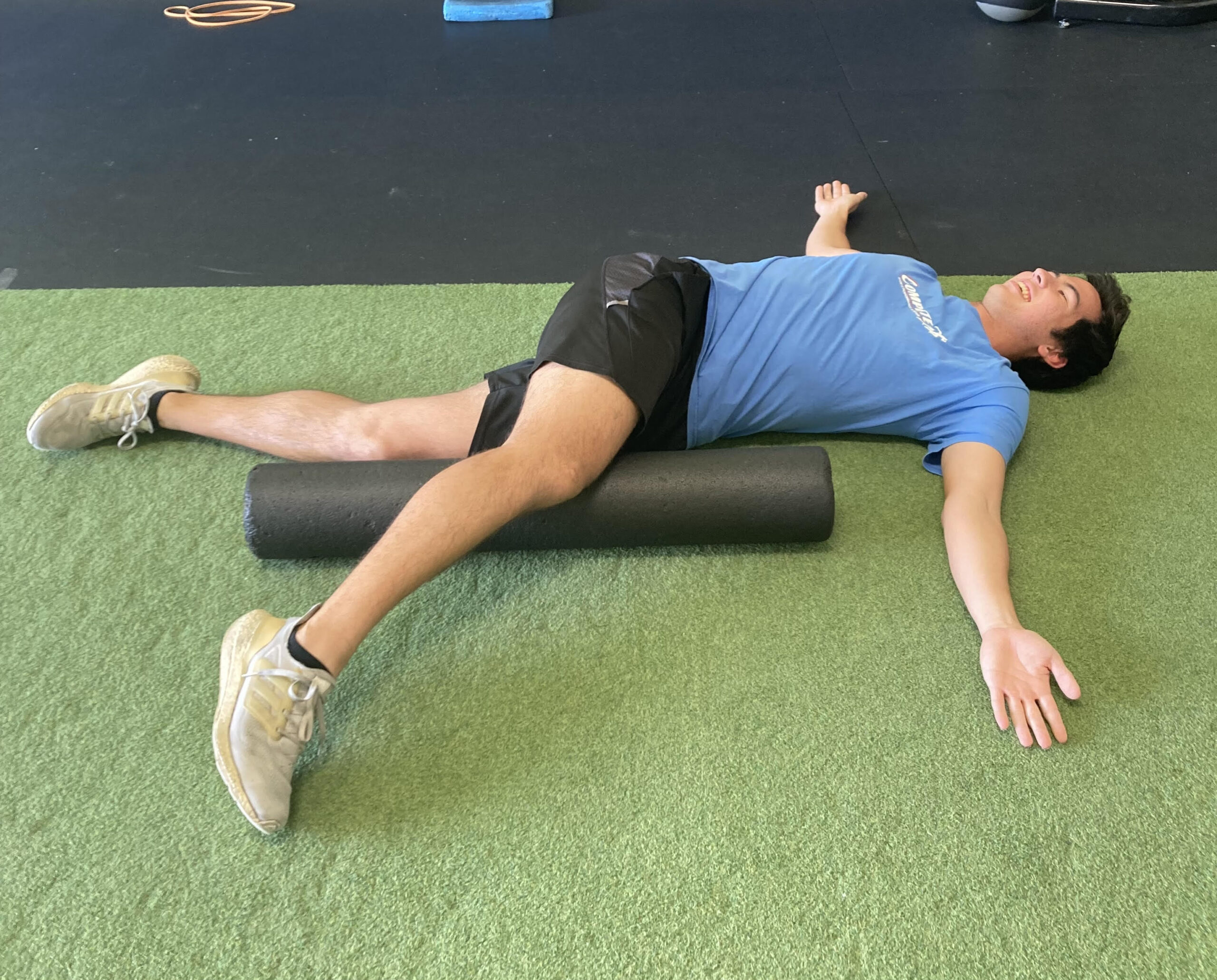 A foam roller placed along the spine helps improve extension, which supports better rotation. I lie back with the roller lengthwise and open my arms to the sides. This position encourages the chest to expand and frees up the mid-back.